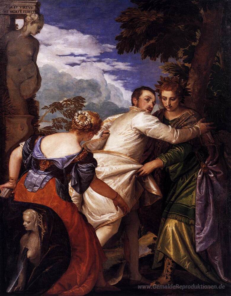 Wir bieten Ihnen eine handgefertigte Reproduktion auf Leinwand des berühmten Kunstwerks 'Ehre und die Macht nach dem Tod von Schnörkeln' von Paolo Veronese, aus dem Reproduktionsmuseum.