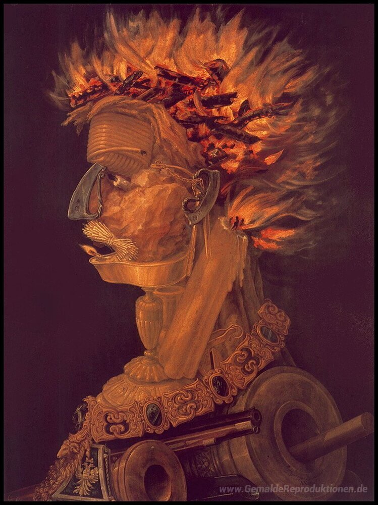 Wir bieten Ihnen eine handgefertigte Reproduktion auf Leinwand des berühmten Kunstwerks 'Feuer' von Giuseppe Arcimboldo, aus dem Reproduktionsmuseum.