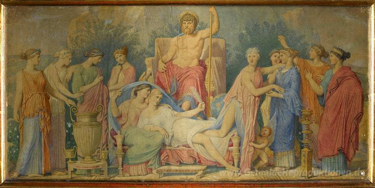 Wir bieten Ihnen eine handgefertigte Reproduktion auf Leinwand des berühmten Kunstwerks 'Geburt der Musen' von Jean Auguste Dominique Ingres, aus dem Reproduktionsmuseum.
