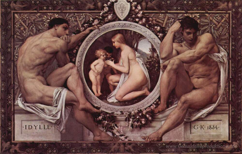 Wir bieten Ihnen eine handgefertigte Reproduktion auf Leinwand des berühmten Kunstwerks 'Idylle (Idyllen)' von Gustav Klimt, aus dem Reproduktionsmuseum.