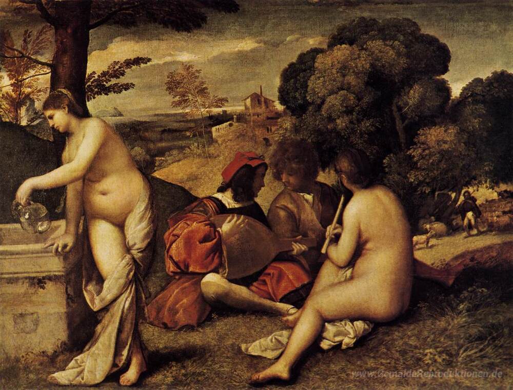 Wir bieten Ihnen eine handgefertigte Reproduktion auf Leinwand des berühmten Kunstwerks 'Ländliches Konzert (Fête champêtre)' von Giorgione, aus dem Reproduktionsmuseum.