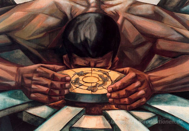 Wir bieten Ihnen eine handgefertigte Reproduktion auf Leinwand des berühmten Kunstwerks 'Mural für Menschenrechte. Emblem Un (Detail)' von Vela Zanetti, aus dem Reproduktionsmuseum.