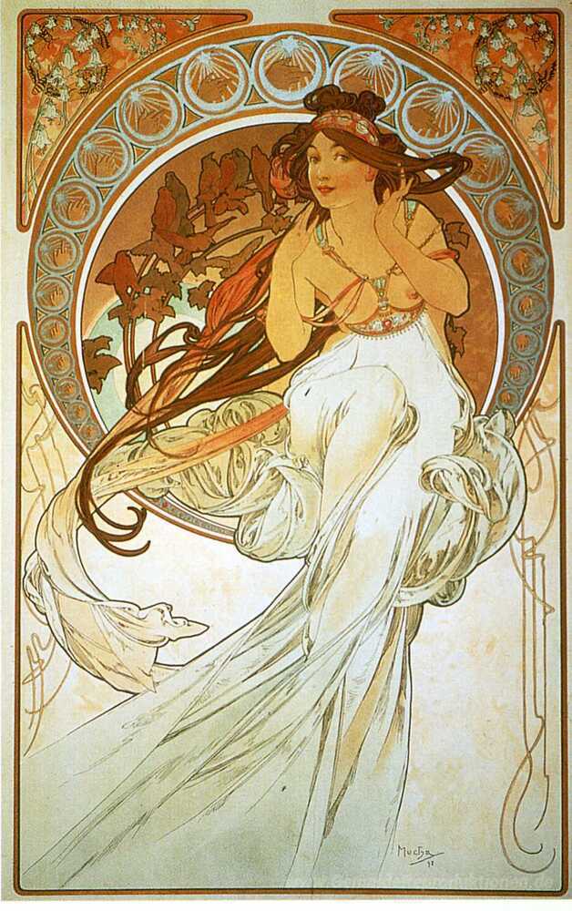 Wir bieten Ihnen eine handgefertigte Reproduktion auf Leinwand des berühmten Kunstwerks 'Musik' von Alphonse Mucha, aus dem Reproduktionsmuseum.