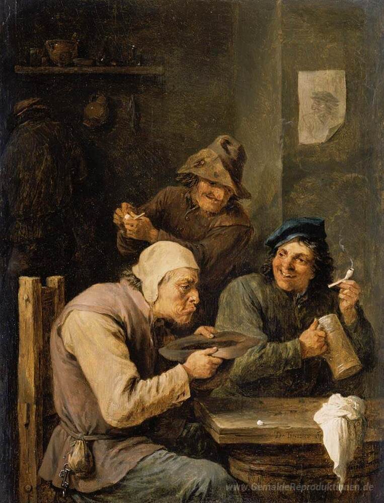 Wir bieten Ihnen eine handgefertigte Reproduktion auf Leinwand des berühmten Kunstwerks 'The Hustle Cap' von David Teniers the Younger, aus dem Reproduktionsmuseum.