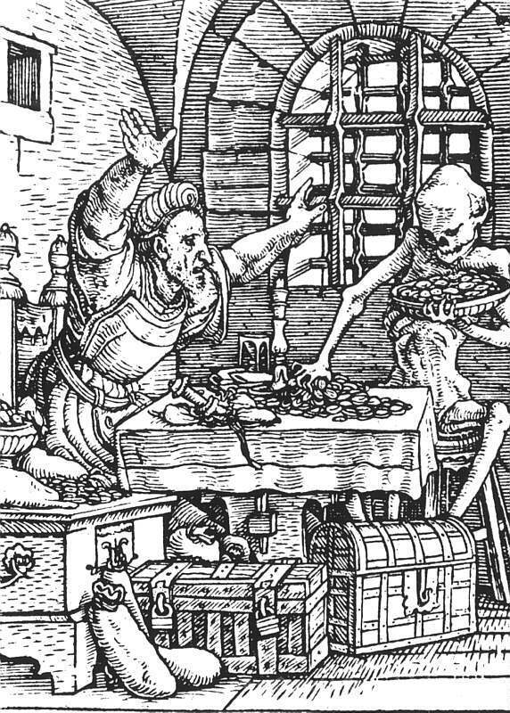 Wir bieten Ihnen eine handgefertigte Reproduktion auf Leinwand des berühmten Kunstwerks 'Tod des Geizhalses, von The Dance of Death' von Hans Holbein the Younger, aus dem Reproduktionsmuseum.