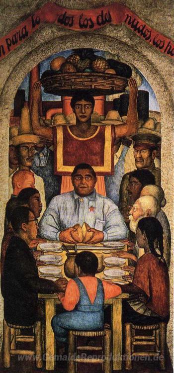 Wir bieten Ihnen eine handgefertigte Reproduktion auf Leinwand des berühmten Kunstwerks 'Unser Brot' von Diego Rivera, aus dem Reproduktionsmuseum.