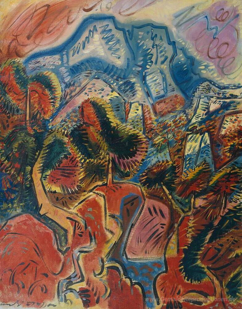 Wir bieten Ihnen eine handgefertigte Reproduktion auf Leinwand des berühmten Kunstwerks 'Die Red Lands und der Montagne Sainte Victoire' von Andre Masson, aus dem Reproduktionsmuseum.