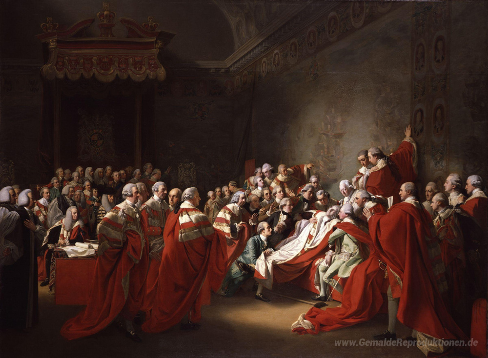 Wir bieten Ihnen eine handgefertigte Reproduktion auf Leinwand des berühmten Kunstwerks ' Der Tod des Grafen von Chatham' von John Singleton Copley, aus dem Reproduktionsmuseum.