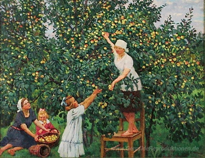 Wir bieten Ihnen eine handgefertigte Reproduktion auf Leinwand des berühmten Kunstwerks 'Äpfel' von Konstantin Yuon, aus dem Reproduktionsmuseum.