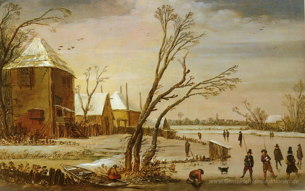 Wir bieten Ihnen eine handgefertigte Reproduktion auf Leinwand des berühmten Kunstwerks 'A Frozen River mit Eisläufern' von Esaias van de Velde, aus dem Reproduktionsmuseum.