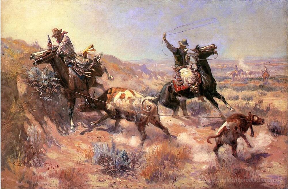Wir bieten Ihnen eine handgefertigte Reproduktion auf Leinwand des berühmten Kunstwerks 'A Serious Predicament' von Charles M. Russell, aus dem Reproduktionsmuseum.