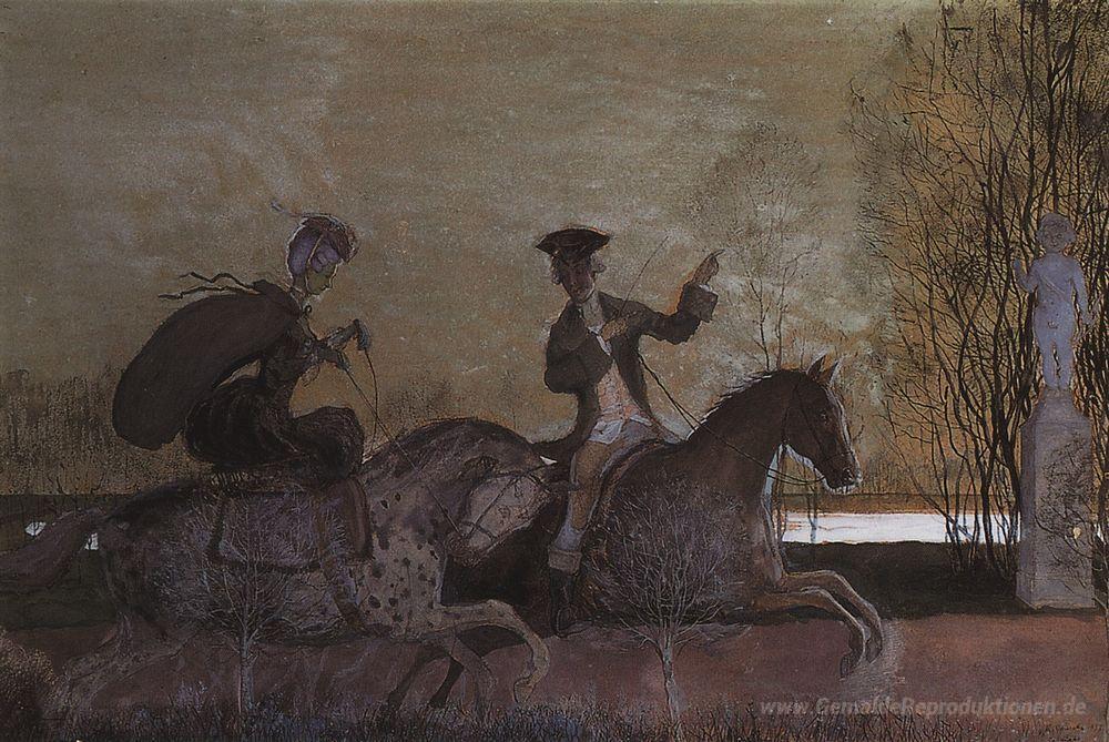 Wir bieten Ihnen eine handgefertigte Reproduktion auf Leinwand des berühmten Kunstwerks 'Abendfahrten' von Konstantin Somov, aus dem Reproduktionsmuseum.