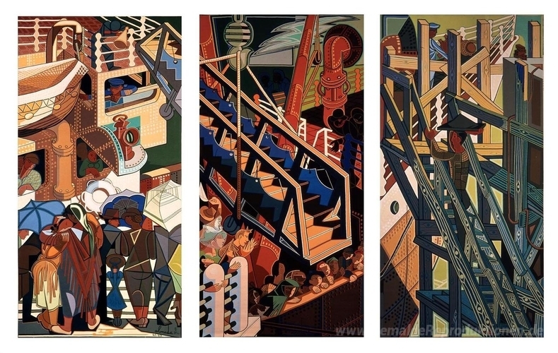 Wir bieten Ihnen eine handgefertigte Reproduktion auf Leinwand des berühmten Kunstwerks 'Abfahrt von Einwanderern, Wandteppiche' von Jose de Almada-Negreiros, aus dem Reproduktionsmuseum.