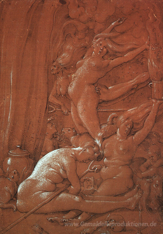 Wir bieten Ihnen eine handgefertigte Reproduktion auf Leinwand des berühmten Kunstwerks 'Abreise für den Sabbat' von Hans Baldung, aus dem Reproduktionsmuseum.