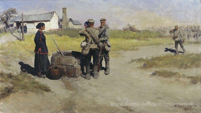 Wir bieten Ihnen eine handgefertigte Reproduktion auf Leinwand des berühmten Kunstwerks 'Am Brunnen' von Ivan Vladimirov, aus dem Reproduktionsmuseum.