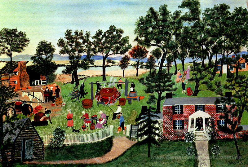 Wir bieten Ihnen eine handgefertigte Reproduktion auf Leinwand des berühmten Kunstwerks 'Apple Butter Herstellung' von Grandma Moses, aus dem Reproduktionsmuseum.