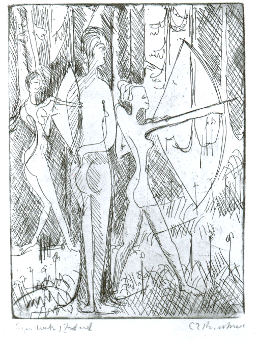 Wir bieten Ihnen eine handgefertigte Reproduktion auf Leinwand des berühmten Kunstwerks 'Arching Mädchen im Holz' von Ernst Ludwig Kirchner, aus dem Reproduktionsmuseum.