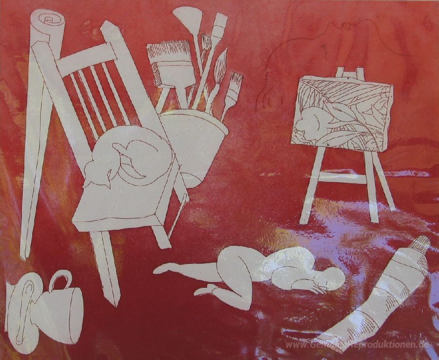 Wir bieten Ihnen eine handgefertigte Reproduktion auf Leinwand des berühmten Kunstwerks 'Atelier Rouge' von Charles Blackman, aus dem Reproduktionsmuseum.