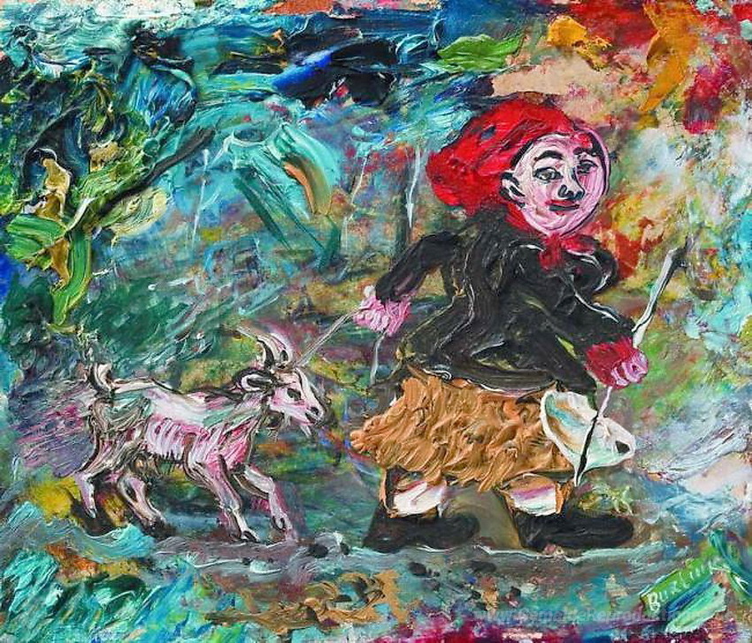 Wir bieten Ihnen eine handgefertigte Reproduktion auf Leinwand des berühmten Kunstwerks 'Bäuerin mit einer Ziege' von David Burliuk, aus dem Reproduktionsmuseum.