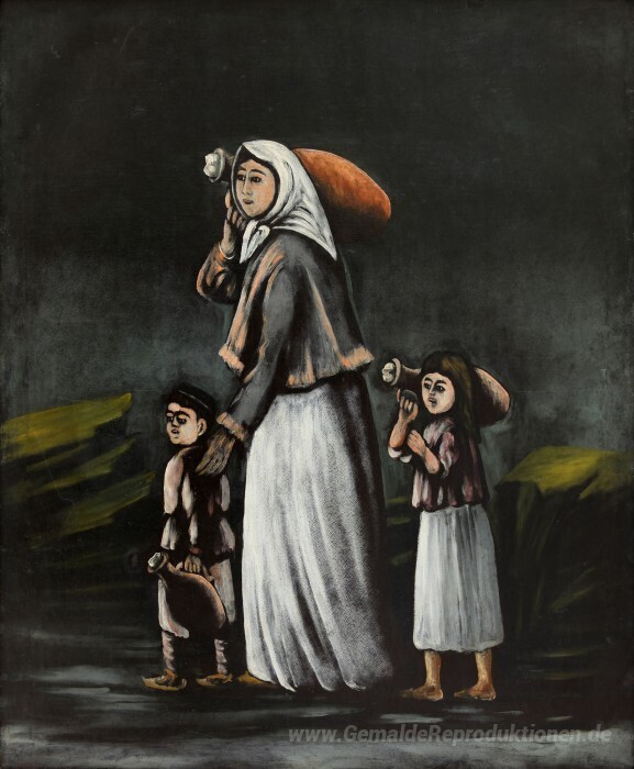 Wir bieten Ihnen eine handgefertigte Reproduktion auf Leinwand des berühmten Kunstwerks 'Bäuerin mit Kind geht zum Wasser' von Niko Pirosmani, aus dem Reproduktionsmuseum.