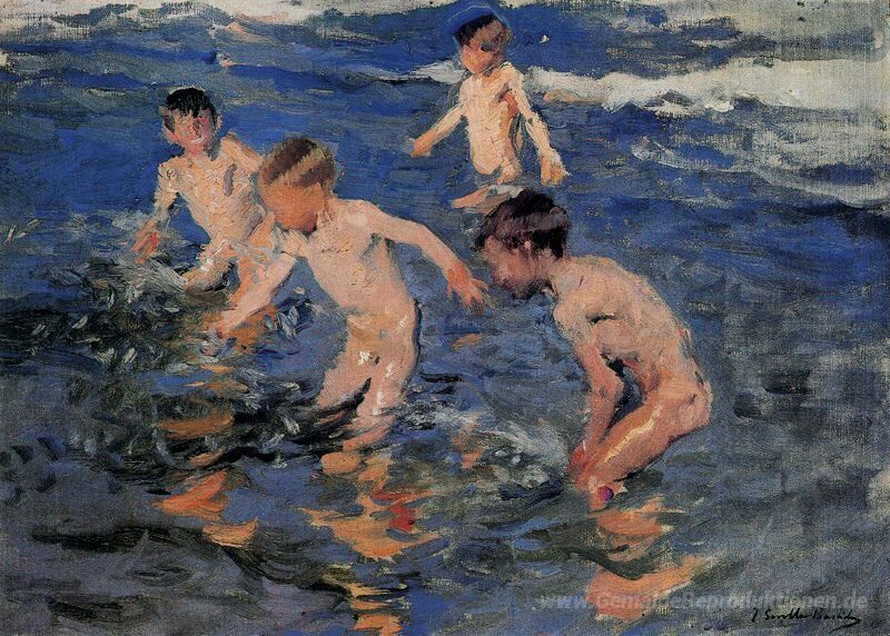 Wir bieten Ihnen eine handgefertigte Reproduktion auf Leinwand des berühmten Kunstwerks 'Baden' von Joaquín Sorolla, aus dem Reproduktionsmuseum.