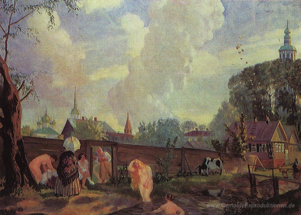 Wir bieten Ihnen eine handgefertigte Reproduktion auf Leinwand des berühmten Kunstwerks 'Badende' von Boris Kustodiev, aus dem Reproduktionsmuseum.