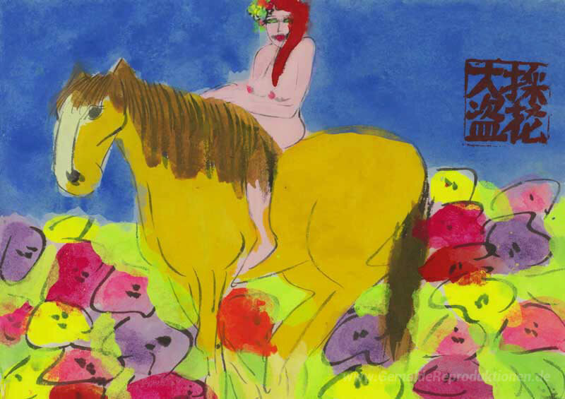 Wir bieten Ihnen eine handgefertigte Reproduktion auf Leinwand des berühmten Kunstwerks 'Bare Back Reiter' von Walasse Ting, aus dem Reproduktionsmuseum.