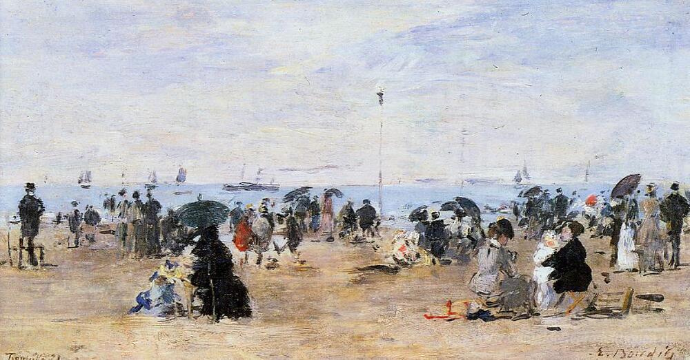 Wir bieten Ihnen eine handgefertigte Reproduktion auf Leinwand des berühmten Kunstwerks 'Beach Scene' von Eugene Boudin, aus dem Reproduktionsmuseum.