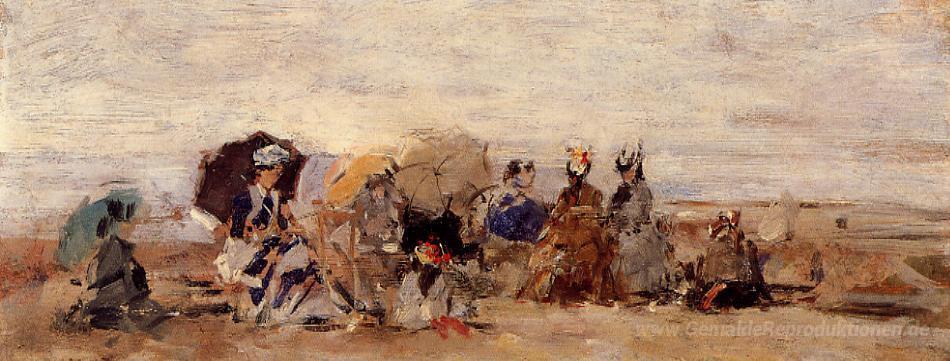 Wir bieten Ihnen eine handgefertigte Reproduktion auf Leinwand des berühmten Kunstwerks 'Beach Scene' von Eugene Boudin, aus dem Reproduktionsmuseum.