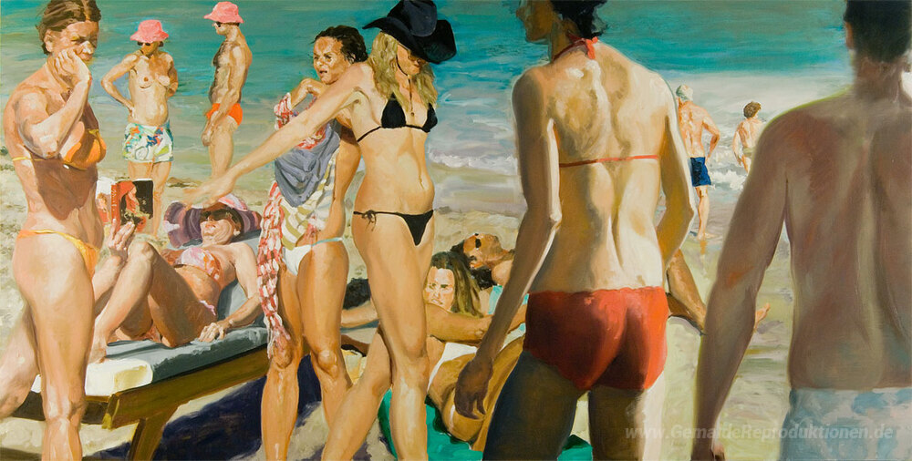Wir bieten Ihnen eine handgefertigte Reproduktion auf Leinwand des berühmten Kunstwerks 'Beach-Szene mit rosa Hut' von Eric Fischl, aus dem Reproduktionsmuseum.