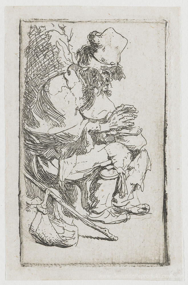 Wir bieten Ihnen eine handgefertigte Reproduktion auf Leinwand des berühmten Kunstwerks 'Beggar Thronender Erwärmung seine Hände an einem Rechaud' von Rembrandt, aus dem Reproduktionsmuseum.