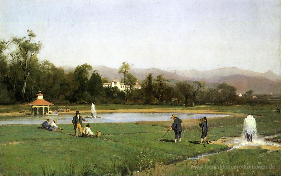 Wir bieten Ihnen eine handgefertigte Reproduktion auf Leinwand des berühmten Kunstwerks 'Bewässerung bei Strawberry Farm' von Thomas Hill, aus dem Reproduktionsmuseum.