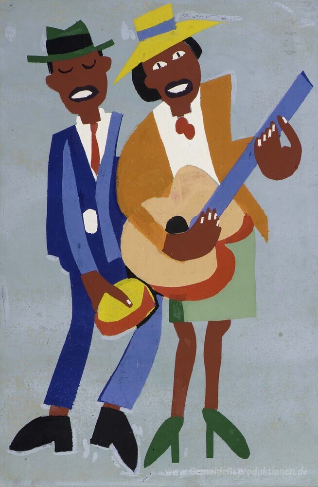 Willkommen in der faszinierenden Welt der Ölgemälde, wo jede Farbnuance und Pinselstrich eine Geschichte erzählt. Unser Highlight ist das bemerkenswerte Werk Blind Singer (Street Musicians) des renommierten Künstlers William H. Johnson. Johnson, bekannt für seinen einzigartigen Ausdruck und seine starke Verbindung zur afroamerikanischen Kultur, verbindet lebendige Farben mit dynamischen Formen, um seine Emotionen und Erfahrungen widerzuspiegeln.