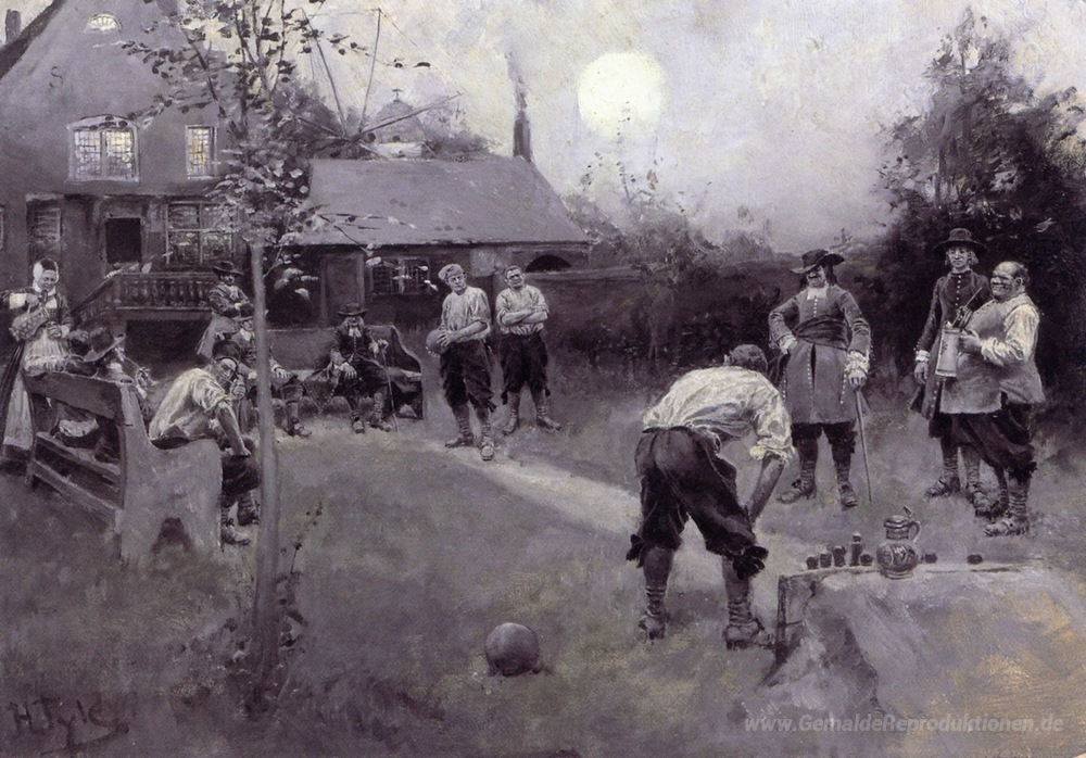Wir bieten Ihnen eine handgefertigte Reproduktion auf Leinwand des berühmten Kunstwerks 'Bowling' von Howard Pyle, aus dem Reproduktionsmuseum.