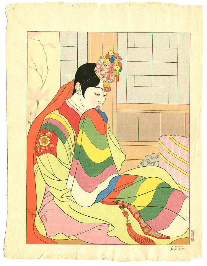Jedes Ölgemälde von Jacoulet erzählt eine Geschichte und hat die Kraft, jede Atmosphäre zu transformieren. Brautleute im Dorf. Coree fängt das Leben und die Kultur in einer Art und Weise ein, die den Betrachter in eine andere Welt entführt. Der Einsatz lebendiger Farben und feiner Details verleiht jedem Raum eine besondere Note. Lassen Sie sich von der Magie dieser Kunstwerke inspirieren und verleihen Sie Ihrem Zuhause mit einem Meisterwerk von Paul Jacoulet eine unverwechselbare Eleganz.