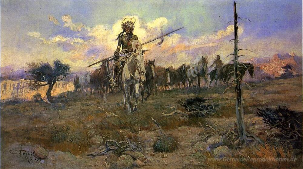 Wir bieten Ihnen eine handgefertigte Reproduktion auf Leinwand des berühmten Kunstwerks 'Bringing home the Spoils' von Charles M. Russell, aus dem Reproduktionsmuseum.