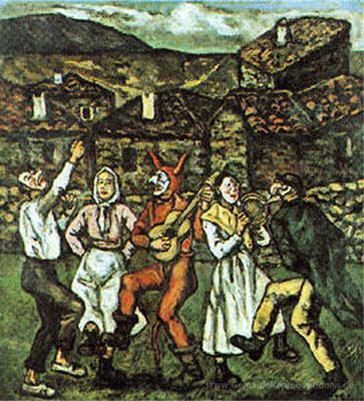 Wir bieten Ihnen eine handgefertigte Reproduktion auf Leinwand des berühmten Kunstwerks 'Carnival in einem Dorf' von Jose Gutierrez Solana, aus dem Reproduktionsmuseum.