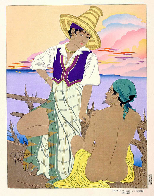 Wir bieten Ihnen eine handgefertigte Reproduktion auf Leinwand des berühmten Kunstwerks 'Coucher de soleil A Menado. Celebes' von Paul Jacoulet, aus dem Reproduktionsmuseum.
