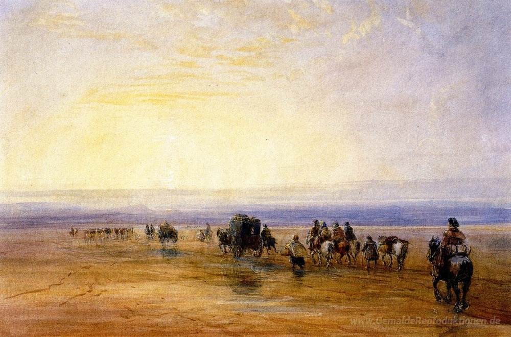 Wir bieten Ihnen eine handgefertigte Reproduktion auf Leinwand des berühmten Kunstwerks 'Crossing Lancaster Sands' von David Cox, aus dem Reproduktionsmuseum.