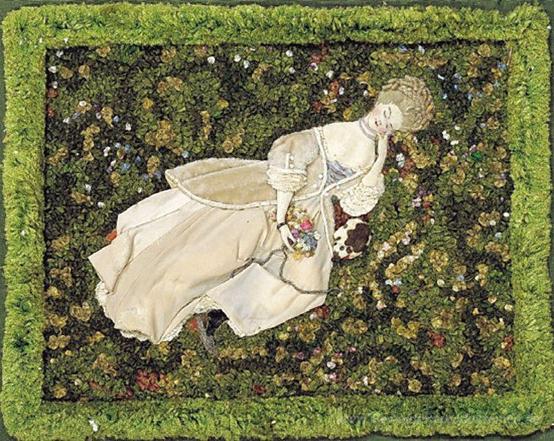 Wir bieten Ihnen eine handgefertigte Reproduktion auf Leinwand des berühmten Kunstwerks 'Dame mit dem Hündchen, entspannt auf dem Rasen' von Konstantin Somov, aus dem Reproduktionsmuseum.
