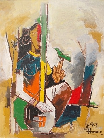 Wir bieten Ihnen eine handgefertigte Reproduktion auf Leinwand des berühmten Kunstwerks 'Dame mit Veena' von M.F. Husain, aus dem Reproduktionsmuseum.