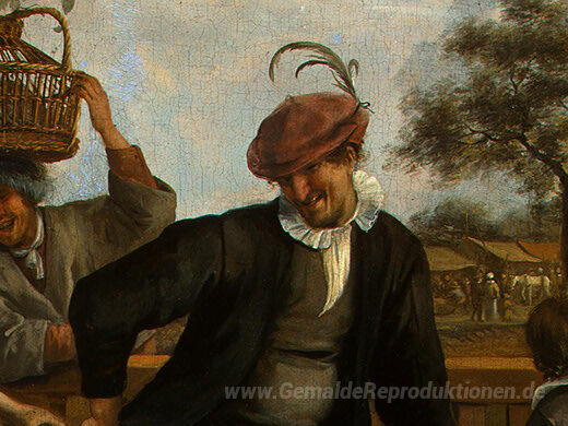 Wir bieten Ihnen eine handgefertigte Reproduktion auf Leinwand des berühmten Kunstwerks 'Dancing couple (Detail)' von Jan Steen, aus dem Reproduktionsmuseum.