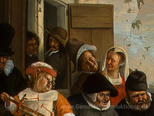 Wir bieten Ihnen eine handgefertigte Reproduktion auf Leinwand des berühmten Kunstwerks 'Dancing couple (Detail)' von Jan Steen, aus dem Reproduktionsmuseum.