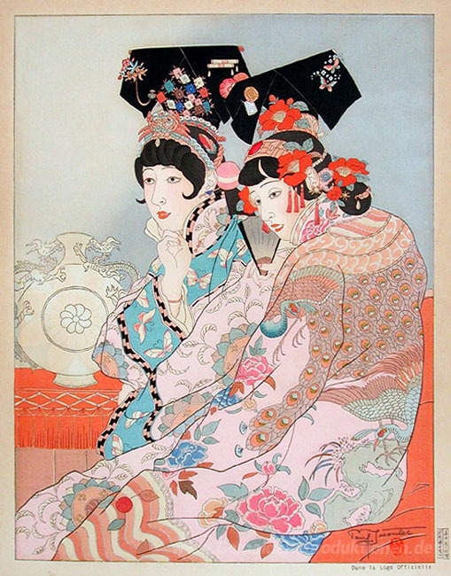 Wir bieten Ihnen eine handgefertigte Reproduktion auf Leinwand des berühmten Kunstwerks 'Dans La Loge Officielle' von Paul Jacoulet, aus dem Reproduktionsmuseum.