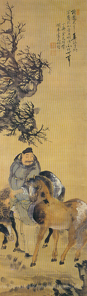 Wir bieten Ihnen eine handgefertigte Reproduktion auf Leinwand des berühmten Kunstwerks 'Das Bild von einem Mann mit zwei Pferden' von Owon, aus dem Reproduktionsmuseum.