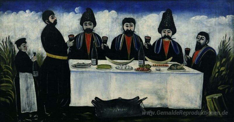 Wir bieten Ihnen eine handgefertigte Reproduktion auf Leinwand des berühmten Kunstwerks 'Das Fest von vier Bürgern' von Niko Pirosmani, aus dem Reproduktionsmuseum.