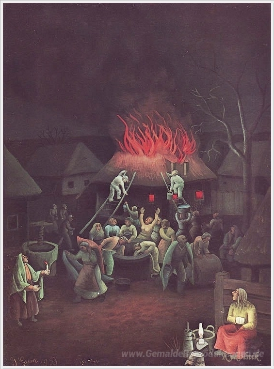 Wir bieten Ihnen eine handgefertigte Reproduktion auf Leinwand des berühmten Kunstwerks 'Das Feuer' von Ivan Generalic, aus dem Reproduktionsmuseum.