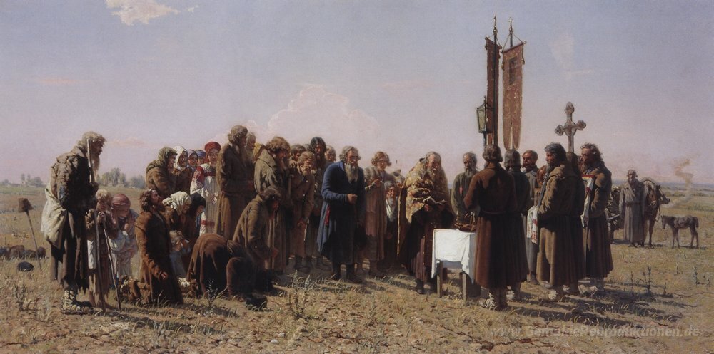 Wir bieten Ihnen eine handgefertigte Reproduktion auf Leinwand des berühmten Kunstwerks 'Das Gebet in der Zeit der Dürre' von Grigoriy Myasoyedov, aus dem Reproduktionsmuseum.