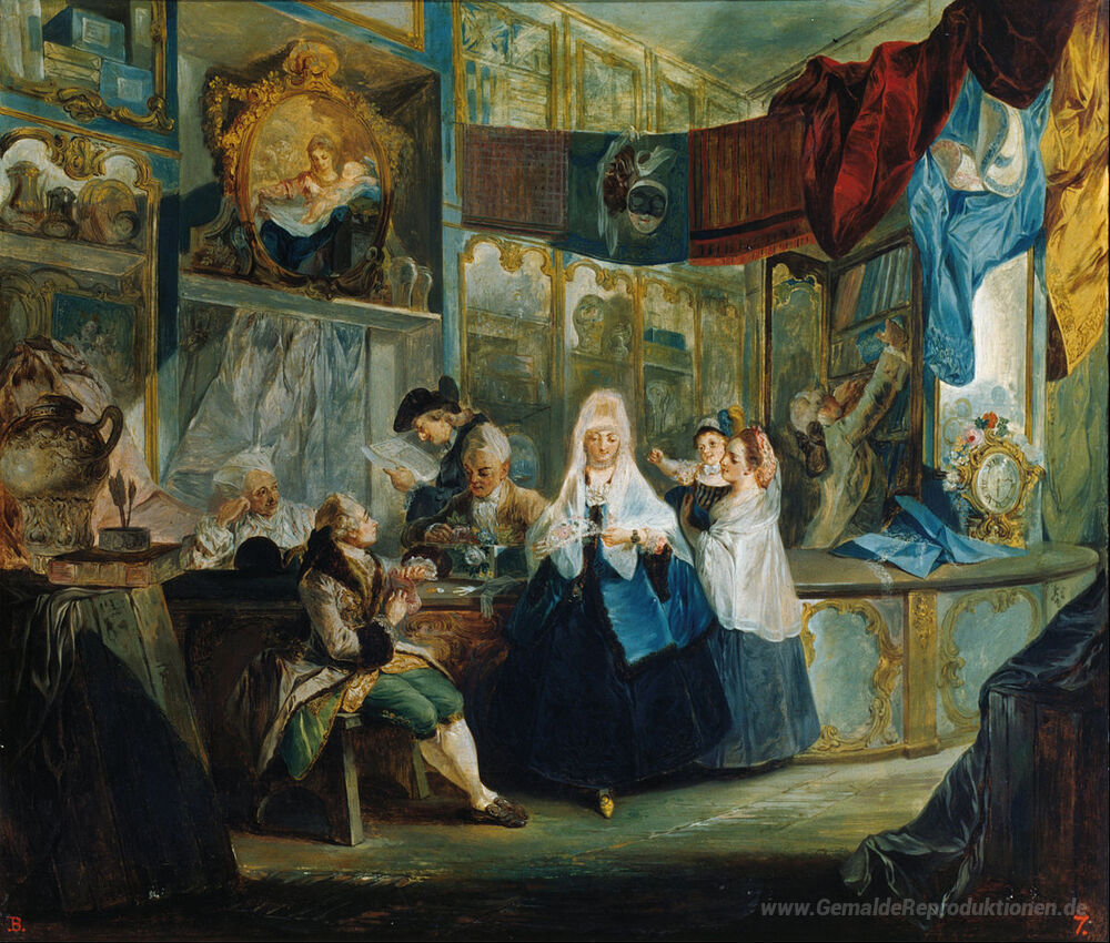 Wir bieten Ihnen eine handgefertigte Reproduktion auf Leinwand des berühmten Kunstwerks 'Das Geschäft' von Luis Paret y Alcazar, aus dem Reproduktionsmuseum.