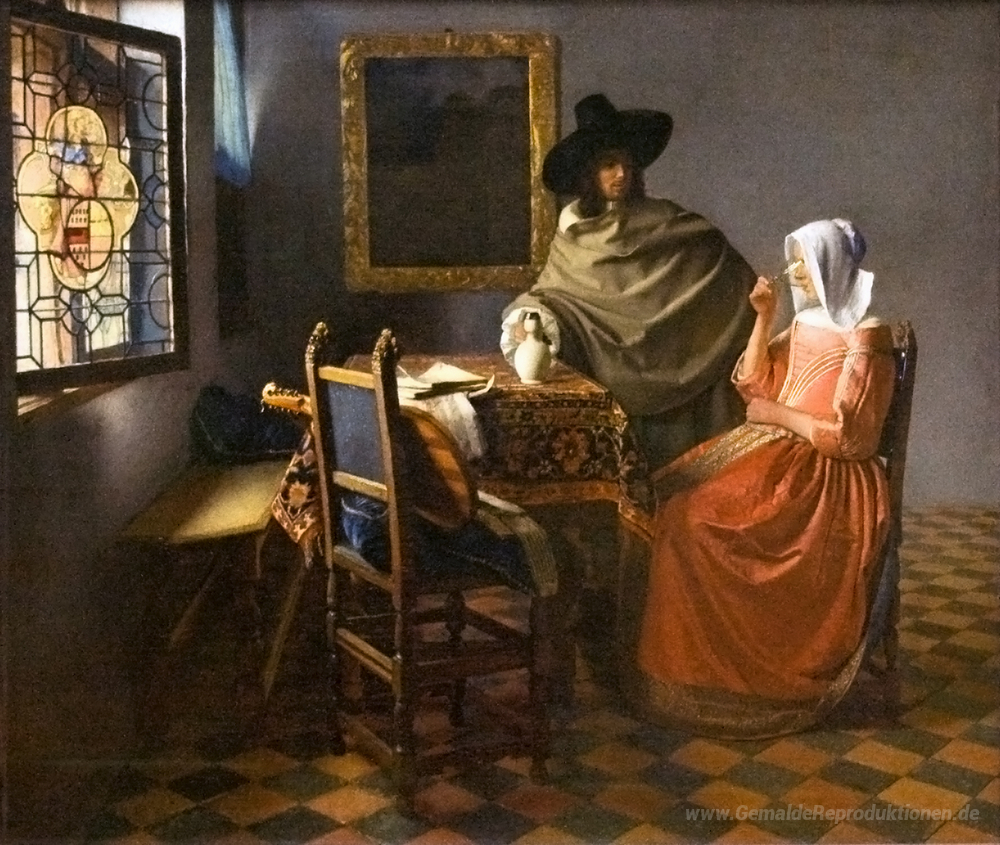 Wir bieten Ihnen eine handgefertigte Reproduktion auf Leinwand des berühmten Kunstwerks 'Das Glas Wein' von Johannes Vermeer, aus dem Reproduktionsmuseum.